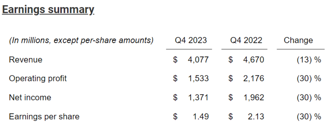 전 텍사스 기기는 2023q4 매출이 40 억 8 천만 달러로 전 분기에서 10 %, 작년 같은 기간 13 % 감소한 것으로보고했다.순이익은 137 억 달러 였고 주당 수입은 $ 1.49였습니다.운영 이익은 작년 같은 기간보다 30 % 감소한 15 억 달러 또는 38 %의 매출이었다.
