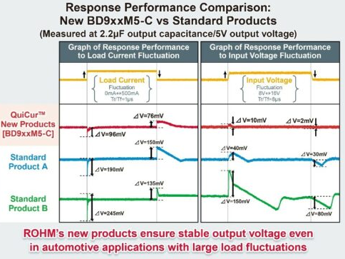 ECUS 및 기타 다운 스트림 장치는 작동 중에 부하 전류 변형을 자주 겪으므로 탁월한 부하 거래 응답 특성을 갖는 LDO가 필요합니다.고주파 응답은 빠른 출력 전압 복구에 중요하지만 안정적인 작동을 보장하기 위해 충분한 위상 마진을 달성하는 데 어려움이 있습니다.이러한 문제를 해결하기 위해 회사는 독점적 인 Quicur 고속 부하 응답 기술을 사용하여 BD9XXM5-C 시리즈를 개발했습니다.이 기술은 LDO가 1μs에서 0과 500mA 사이에서 빠르게 변화하더라도 설정 전압의 100MV 내에서 출력을 유지할 수 있습니다.9.5µa (일반)의 낮은 전류 소비는 자동차 응용 프로그램에서 전력 소비를 줄입니다.