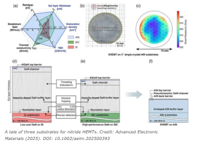 혁신의 중심에는 격자 정합 재료 스택이 있습니다. 즉, 자연적으로 낮은 결함 밀도와 뛰어난 열 전도성을 갖춘 초광대역 밴드갭 반도체인 AlN 위에 성장한 초박형 질화갈륨(GaN) 층입니다.이 페어링을 통해 트랜지스터는 더 뜨겁고 더 높은 전압 작동을 견딜 수 있으며, RF 시스템이 고주파 밀리미터파 영역으로 더 깊이 들어가면서 전기를 억제하면 주요 요구 사항이 손실됩니다.