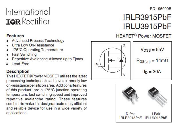 메시지irlu3915pbf Hexfet® Power MOSFET 55V I-PAK 패키지의 단일 N- 채널 헥트 페트 파워 MOSFET