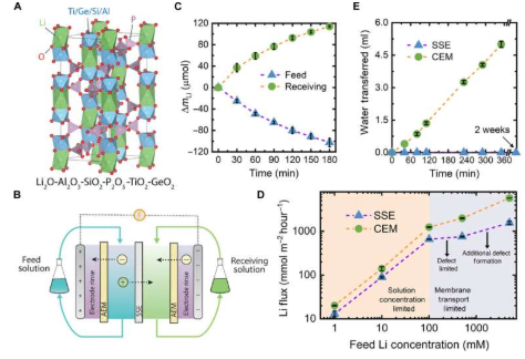 고체 배터리에서 리튬 이온 전도를 위해 설계된 초기에 SSE는 전례없는 수준의 이온 분리를 가능하게하기 위해 용도 변경되었습니다.이온 수송에 나노 스케일 구멍을 사용하는 기존의 막과는 달리, SSE는 강성 결정 격자 내에서 무수 호핑 메커니즘을 통해 작동합니다.이 구조는 나트륨 및 마그네슘과 같은 경쟁 이온을 효과적으로 차단하여 리튬 만 통과 할 수있게합니다.
